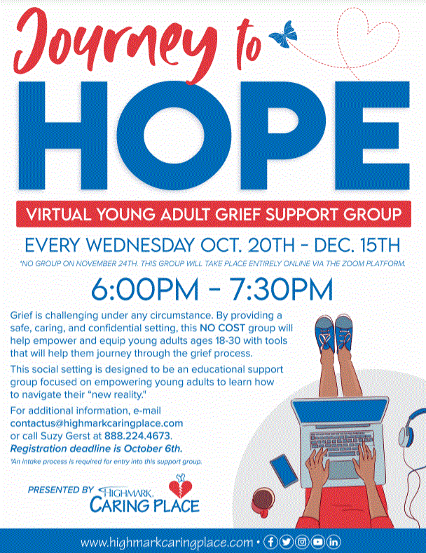 These online groups provide a safe, caring, and confidential setting. The groups are designed to help empower and equip young adults with tools to provide a framework for navigating grief. At the same time, you’ll get to hear from your peers who are struggling with and sometimes overcoming some of the same issues you’re dealing with.
