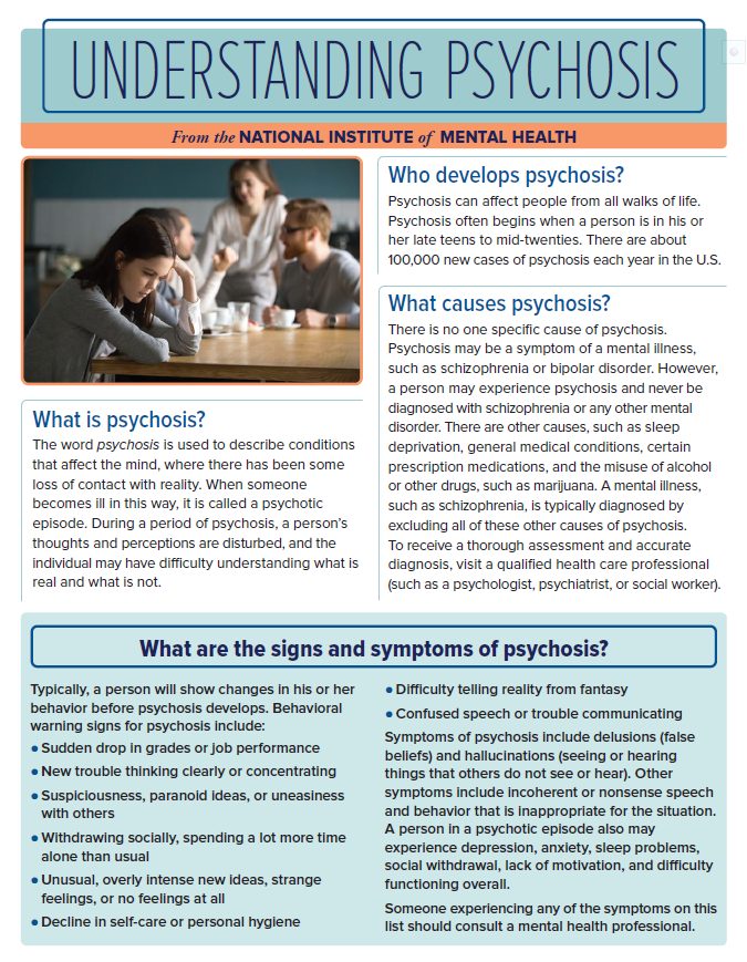 The National Institute of Mental Health (NIMH) provides brochures and fact sheets on psychosis and other mental disorders and related topics.
