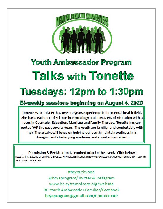 Talks with Tonette Click to meet Tonette on YouTube Bi-weekly sessions beginning on August 4, 2020 Tuesdays: 12:00pm to 1:30pm All participants must register! Click here. Print / Share the flyer Talks with Tonette for Social Media Post Views: 297